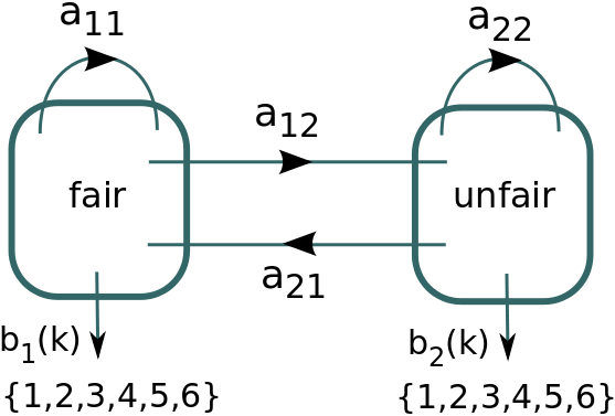 The figure below is a diagram of a simple HMM modelling a dishonest casino dealer. The dealer switches secretly between fair and unfair dice. The fair and unfair die rolls are hidden states.